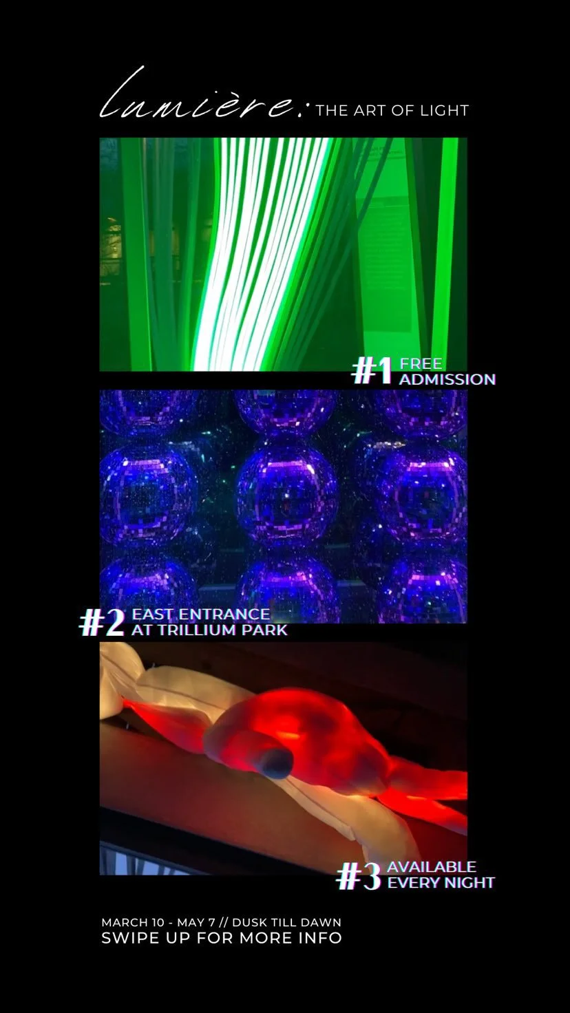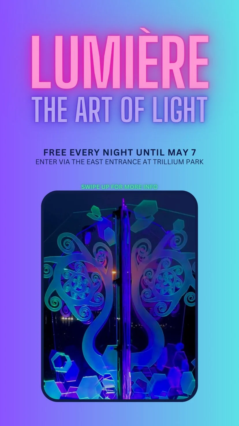 Explore Lumière: The Art of Light (formerly Winter Light Exhibition) in its new home in Trillium Park! This free outdoor light exhibition allows visitors to explore the park and experience art developed by Ontario artists. Utilizing innovation, light and discovery, Artists and creators are illuminating the park under a curatorial theme of “renewal”, celebrating the change of seasons from winter to spring.